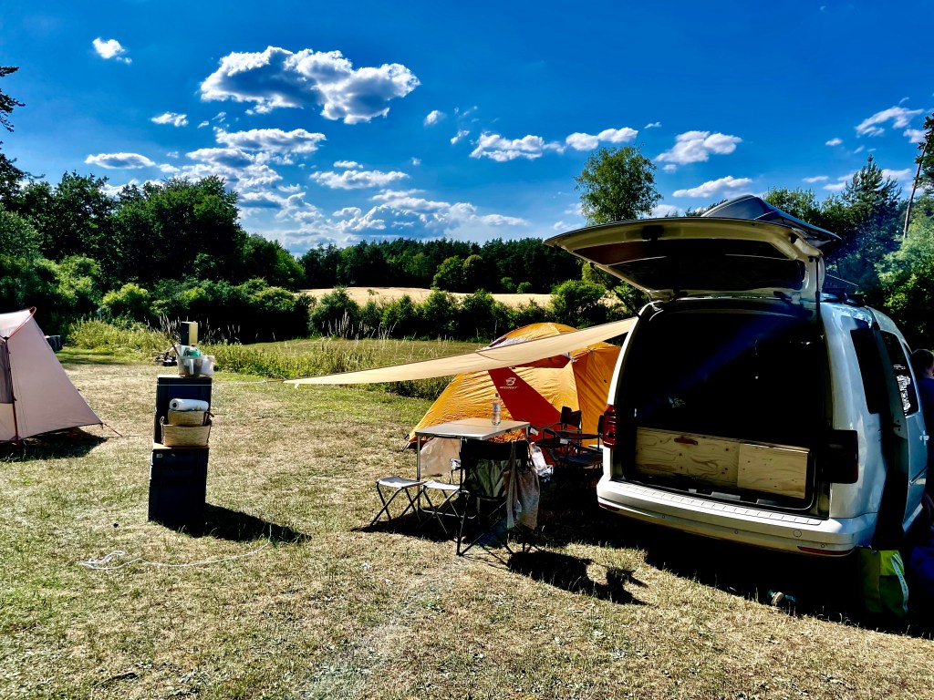Der Caddy macht Meter um Meter durch die Sommerhitze, die Klimaanlage arbeitet am Anschlag. Wir verlassen Brandenburg und kämpfen uns durch Sachsen-Anhalt. Vorbei an Dessau, wir passieren Halle und Leipzig. In Thüringen zeigt das Thermometer kurzzeitig 38 Grad an. Mit leichter Sorge passieren wir zahlreiche, durch Pannen liegengebliebene Fahrzeuge und sind jedes Mal froh, dass wir nicht diejenigen sind, die bei der Gluthitze da draußen gerade auf den Abschleppdienst warten müssen. Nach 3,5 Stunden Fahrt erreichen wir die ehemalige innerdeutsche Grenze und rollen im Freistaat Bayern ein. Da unsere Lust am Autofahren fürs erste gestillt ist und sich leichter Hunger eingestellt hat, beginnen wir mit der Suche nach einem Tagesziel. Wir machen über das Smartephone den kleinen Campingplatz-Jurahöhe, nahe Pottenstein, in der fränkischen Schweiz ausfindig und sehen diesen als geeignetes Tagesziel an. Gekonnt steuern wir den Caddy von der Autobahn und rollen kurz darauf durch die wunderschönen Hügel der Fränkischen Schweiz. Als wir den Campingplatz-Jurahöhe hinter einer völlig unscheinbaren Hofeinfahrt entdecken, haben wir beim Aussteigen aus dem Caddy das Gefühl, dass wir in einen Backofen laufen. 37 Grad, pralle Sonne – uns läuft der Schweiß nur vom rum stehen. Nach wenigen Minuten haben wir uns an der Rezeption einen Platz auf der Zeltwiese gesichert und rollen mit dem Caddy im Schritttempo über den Campingplatz. Wir werden mit neugierigen Blicken der Dauer-Camper empfangen, die uns eindeutig eine wichtige Sache voraus haben: Sie haben kühles Bier und schattige Vorzelt-Plätze. Die Zeltwiese der Jurahöhe bietet leider keinerlei Schatten in der prallen Nachmittagssonne. Dementsprechend zerfließen wir beim Entladen des Caddys und beim Zelt-Aufbau. Notdürftig errichten wir uns einen winzigen Schattenplatz, mit Hilfe eines Sonnensegels, welches wir völlig unbeholfen zwischen Caddy und Zelt anbringen. Zum Glück hat der kleine Kiosk am Campingplatz kühles Bier im Angebot, so dass wir uns kurzzeitig auf unserem Mini-Schattenplatz etwas erfrischen können. Auch wenn wir von anderen Campingplatz-Besuchern mit mitleidigen Blicken bedacht werden, wie wir da so im Schatten unter dem Sonnensegel kauern, tut uns die Erfrischung erstmal gut.