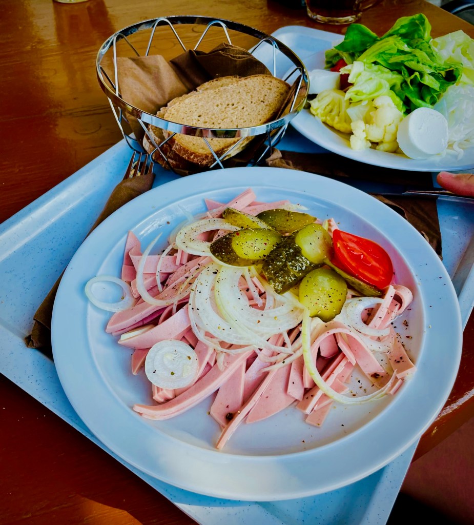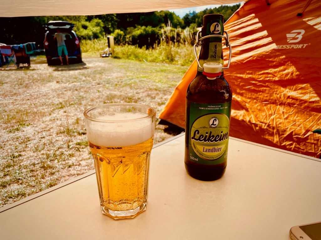 Und wir tragen auch weiterhin zur prächtigen Unterhaltung der erfahrenen, aber neugierigen Mit-Camper auf der Jurahöhe bei. Sei es beim tapsigen Versuch die Gaskartusche unseres Camping-Kochers anzuschließen oder beim ungeschickten Aufbau des Campingtisches. Campingurlaub will gelernt sein und wir waren lange Jahre raus aus diesem Game. Dennoch gelingt es uns nach und nach, unser Lager für die Nacht zu errichten. Um 18 Uhr öffnet das kleine Restaurant auf dem Campingplatz und wir sichern uns den letzten schattigen Tisch. Immer noch 35 Grad im Schatten. Die stämmige Wirtin bringt kühles, frisch gezapftes fränkisches Bier und eine große Portion fränkischen Wurstsalat heran. Wir sind glücklich und die Anspannung des Aufbaus in der Hitze fällt allmählich von uns ab. Kurz darauf steht ein „Juraburger“, ein „Bayrisches Cordon Bleu“, ein Fränkischer Salat und ein Schnitzel mit Pommes auf dem Tisch. Unser Urlaubsgefühl nimmt langsam Fahrt auf!
