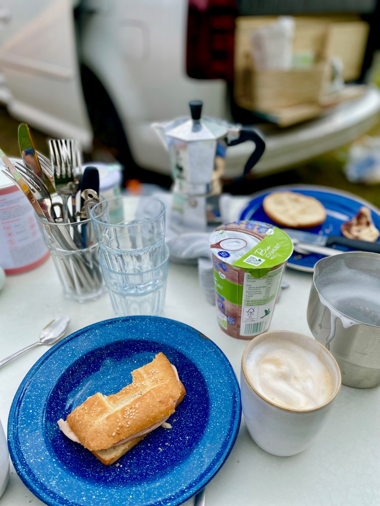 Wir machen uns nun allmählich für die Nacht fertig, besuchen das Sanitärgebäude und wollen dann langsam ins Bett. Tommi kommt noch mal vorbei, um sich zu entschuldigen, dass sie wahrscheinlich schon um 5 Uhr aufbrechen werden und dadurch etwas Lärm machen werden. Wir versichern ihm, dass das gar kein Problem für uns ist und wünschen gute Reise. Kurz nachdem wir im Caddy und im Zelt eingeschlummert sind, bricht das nächste Gewitter los. Blitze zucken über die Fränkische Schweiz, gefolgt von knallendem Donner. Und Dauerregen die ganze Nacht. Wir hören, wie Tommi und seine Familie um 5 Uhr bei strömenden Regen ihr Lager abbrechen und los fahren. Coole Zeltnachbarn, gute Reise und auch sonst alles Gute! Gegen 6 Uhr lässt der Regen nach und als unser Wecker um 8:30 Uhr klingelt, fallen erste Sonnenstrahlen durch die grauen Wolken. Auch wenn draußen alles nass ist, lassen wir uns nicht von den Frühstücksvorbereitungen abbringen. Die Kinder gehen Brötchen am Camping-Platz-Kiosk kaufen und wir setzen die Bialetti in Gang. Kurz darauf sprudelt heißer Kaffee in die vorbereiteten Becher. Die fränkischen Brötchen sind lecker. Und das Zelt hat dem nächtlichen Unwetter getrotzt. Wir fühlen uns mehr denn je gewappnet, für unser Caddy-Camping-Abenteuer!