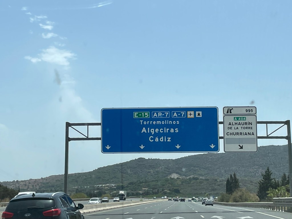 Wir starten einen Sendersuchlauf auf dem Caddy-Radio und bleiben bei einem Sender hängen, auf dem gerade „The Sun“ von Parov Stelar läuft und mit diesem Song, der ja irgendwie gerade zu uns passt, geht es weiter durch den Wilden Westen hier in Andalusien. Irgendwann passieren wir Granada aber unser Hoffnung, von der Autobahn einen Blick auf die riesige Alhambra einfangen zu können, erfüllt sich leider nicht. Wieder hadern wir kurz mit der Tatsache, dass wir auf unserer Reise an so vielen sehenswerten Wundern dieser Welt einfach vorbei fahren, erinnern uns aber kurz darauf wieder, welche Ziele wir noch vor Augen haben und lassen das Hadern dann schnell wieder sein. Wie gesagt: Man muss eben Kompromisse finden, zwischen Verweilen und Kilometer machen. Nach wie vor geht es durch spektakuläre Landschaften. Irgendwann dreht die Fahrtrichtung wieder straight Richtung Süden. Wir lassen die Wild-West-Landschaft hinter uns und steuern Malaga an. Noch so eine Destination, wo man wirklich verweilen könnte, aber wir wollen ja noch weiter in den Süden. Kurz hinter Malaga erblicken wir endlich das Mittelmeer wieder, welches nun zu unserer Linken eine wunderbare, stralend blaue Kulisse für unsere weitere Fahrt bietet. Wir machen noch mal einen kurzen Stopp, um den Kindern ein paar Sandwiches und Kekse zu besorgen, halten uns aber nicht lange auf und gleiten mit dem Caddy weiter durch den 38 Grad heißen Süden Spaniens. Die Verkehrsbeschilderung ist inzwischen zweisprachig: Neben Spanisch wird nun auch alles auf Arabisch ausgeschildert. Immer wieder werden rechts der Straße günstige Fähr-Tickets beworben, für die Überfahrten nach Marokko, die von allerlei Häfen angeboten werden.