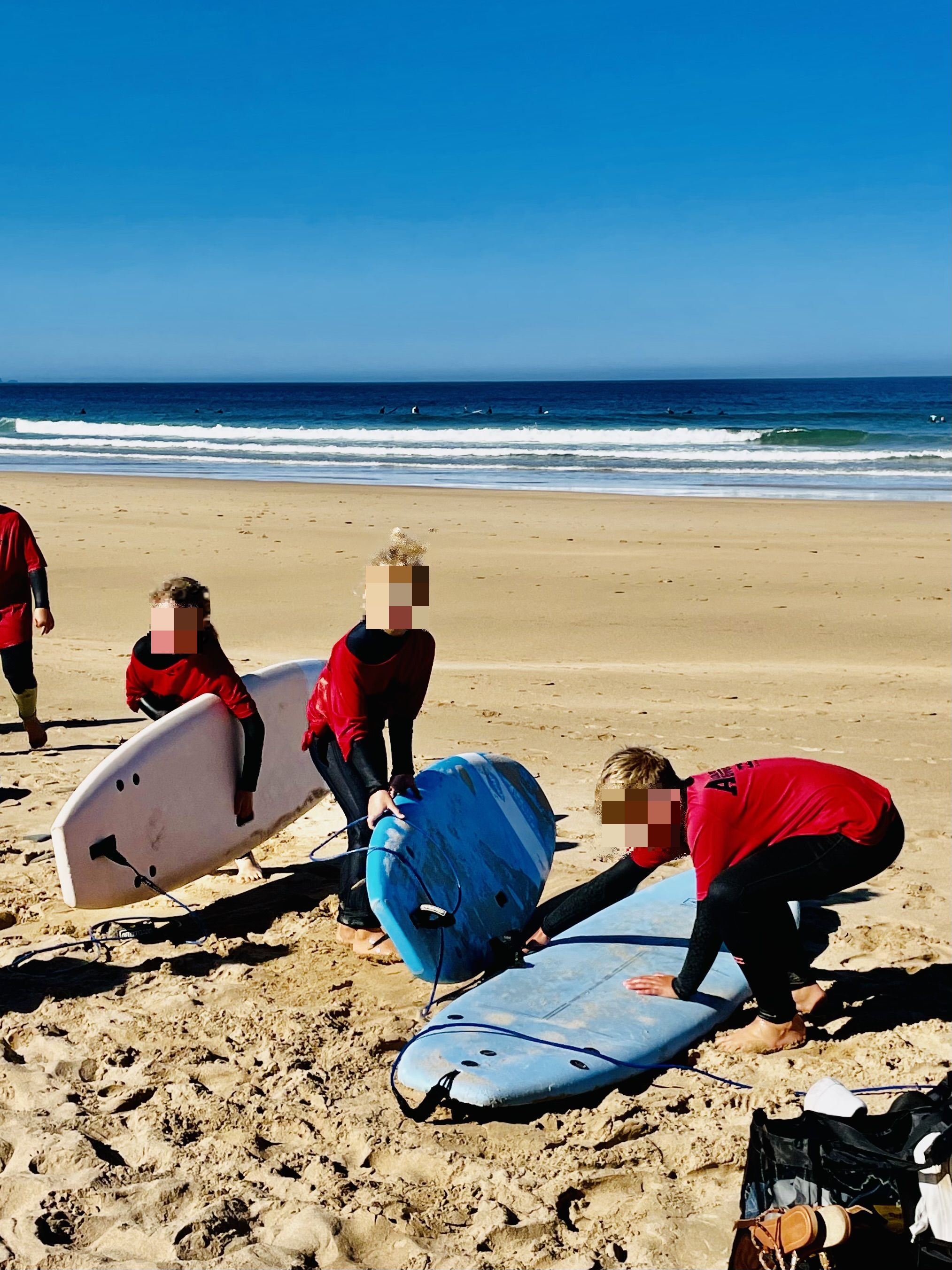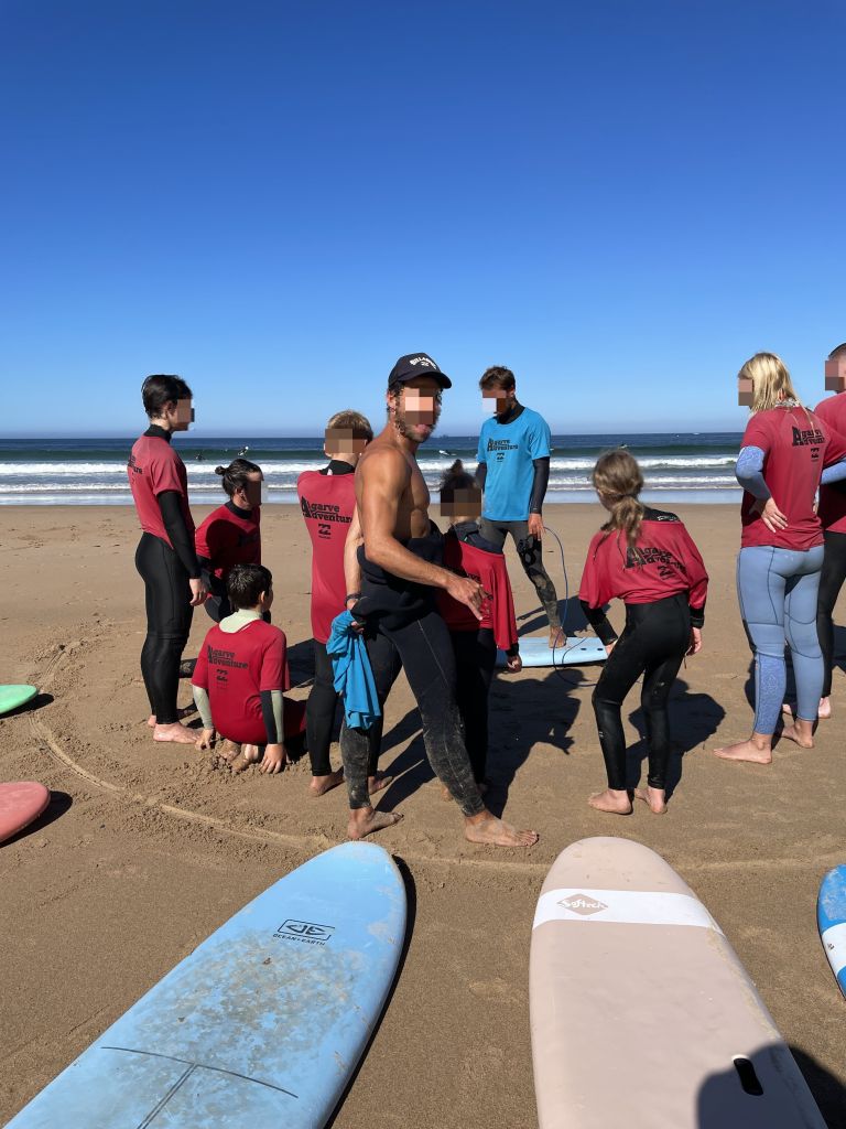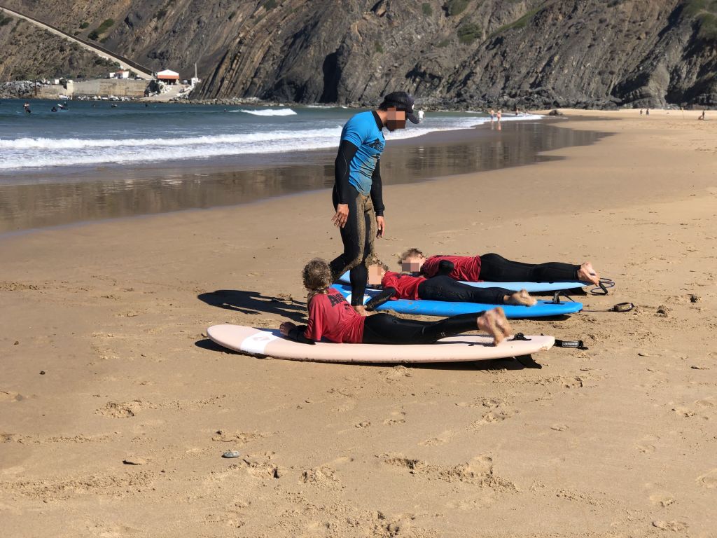 Irgendwann fragt Renato, ob unsere Kinder nicht Lust haben, das Surfen mal auszuprobieren. Er sagt, dass er am nächsten Tag einen neuen Surf-Kurs startet und dass er sich freuen würde, wenn Kind 1 und Kind 2 dabei wären. Die Kinder sind sofort Feuer und Flamme für die Idee. Wir sind in unserem problemorientierten Alman-Style aber natürlich erstmal besorgte Helikopter-Eltern. Wir haben die tosende Brandung hier in Portugal ja gesehen, wir wissen, dass unsere Kinder noch nie auf einem Surfbrett standen. Und wir wissen, dass Kind 2 erst vor ein paar Wochen am heimischen Badesee mit Mühe und Not gerade mal das „Seepferdchen“ geschafft hatte. Wir können uns schwerlich vorstellen, wie man sich da in den Wellen des Atlantiks über Wasser halten kann. Wir tragen unsere Sorgen also Renato vor, aber Renato zerstreut das alles mit seinem entspannten Lächeln. „Ach, kein Problem, macht euch keine Sorgen! Wir werden ein bisschen Spaß in den Wellen haben.“ Und da Karo uns mehrfach versichert, dass Renato ein ganz ausgezeichneter Surflehrer ist, willigen wir schließlich ein. Wir haben ja gelernt: Es gibt keine Probleme – es gibt nur Lösungen. Wir machen uns also am nächsten Tag in aller Frühe auf den Weg nach Arrifana. Dort haben wir uns um 8:30 Uhr mit Renato im „Algarve Advanture Surfcamp“ verabredet. Als wir dort ankommen, ist Renato schon fleißig beschäftigt, zwischen zahlreichen Neoprenanzügen. Er sucht ein paar Anzüge raus, die wir mit Kind 1 und Kind 2 anprobieren sollen. Nach einiger Zeit haben wir passende Anzüge gefunden, in die sich unsere Kinder aber trotzdem mit größter Anstrengung hinein zwängen müssen. Kurz darauf beschreibt uns Renato den Weg zum Strand und erklärt uns, dass wir uns an der großen Treppe runter zum Strand gleich treffen werden. Wir machen uns zu Fuß also auf den Weg und treffen nach ca. 10 Minuten an der großen Treppe ein. Dort wartet Renato inzwischen schon mit einem großen Bully, der voll beladen mit Surfbrettern ist. Er teilt routiniert passende Bretter für alle Kursteilnehmerinnen und Kursteilnehmer aus. Jetzt lautet die nächste Herausforderung, die Surfbretter die steile Treppe zum Strand runter zu tragen. Kind 1 schafft das schon sehr gut alleine, Kind 2 benötigt Unterstützung. Wenig später übernimmt Renato die Kinder unten am Strand und sagt uns, dass wir die Kinder um 11:00 Uhr wieder abholen können. Er beginnt mit dem ganzen Kurs ein umfangreiches Aufwärmprogramm und irgendwann geht es dann in die Wellen. Aus der Ferne beobachten wir, wie Renato die Kinder spielerisch an die Wellen gewöhnt. Nach intensiven Wasserphasen streut Renato immer wieder kleine Spiele am Strand ein, so dass die Zeit für die Kinder wie im Flug vergeht. Was uns am meisten überrascht: Nach zwei Stunden sind bereits erste Erfolge zu sehen. Die Kinder schaffen es teilweise schon, alleine auf dem Brett zu stehen und sich von leichten Wellen an den Strand spülen zu lassen. Zur verabredeten Zeit holen wir die Kinder bei Renato ab. Die Kinder sind durchgefroren, erschöpft aber rundum glücklich. Sie drängen uns, dass wir sie auch an den folgenden Tagen bei Renato zum Surf-Kurs anmelden. Wir fragen bei Renato nach und dieser sagt lächelnd: „Kein Problem“. Und unsere Kinder sind glücklich. Somit haben wir also in den folgenden Tagen einen geregelten Tagesablauf. Es geht früh am Morgen zum Strand von Arrifana, die Kinder starten mit Renato in die Wellen und wir haben frei. Aus der Ferne beobachten wir das muntere Treiben in den Wellen. Es ist mächtig was los hier an jedem Morgen. Viele Surfschulen haben ihre Reviere mit bunten Fahnen abgesteckt und betreiben hier nebeneinander ihr Kursangebot. Renato und seine Surflehrer-Kollegen haben die Lage jederzeit im Griff. Trotz vieler Kursteilnehmer haben sie stets alle Kinder im Blick und bemerken sofort, wenn eines der Kinder in Schwierigkeiten ist und Hilfe benötigt. Das ist für uns sehr beruhigend und so nutzen wir die Zeit, um beispielsweise in Ruhe frühstücken zu gehen.