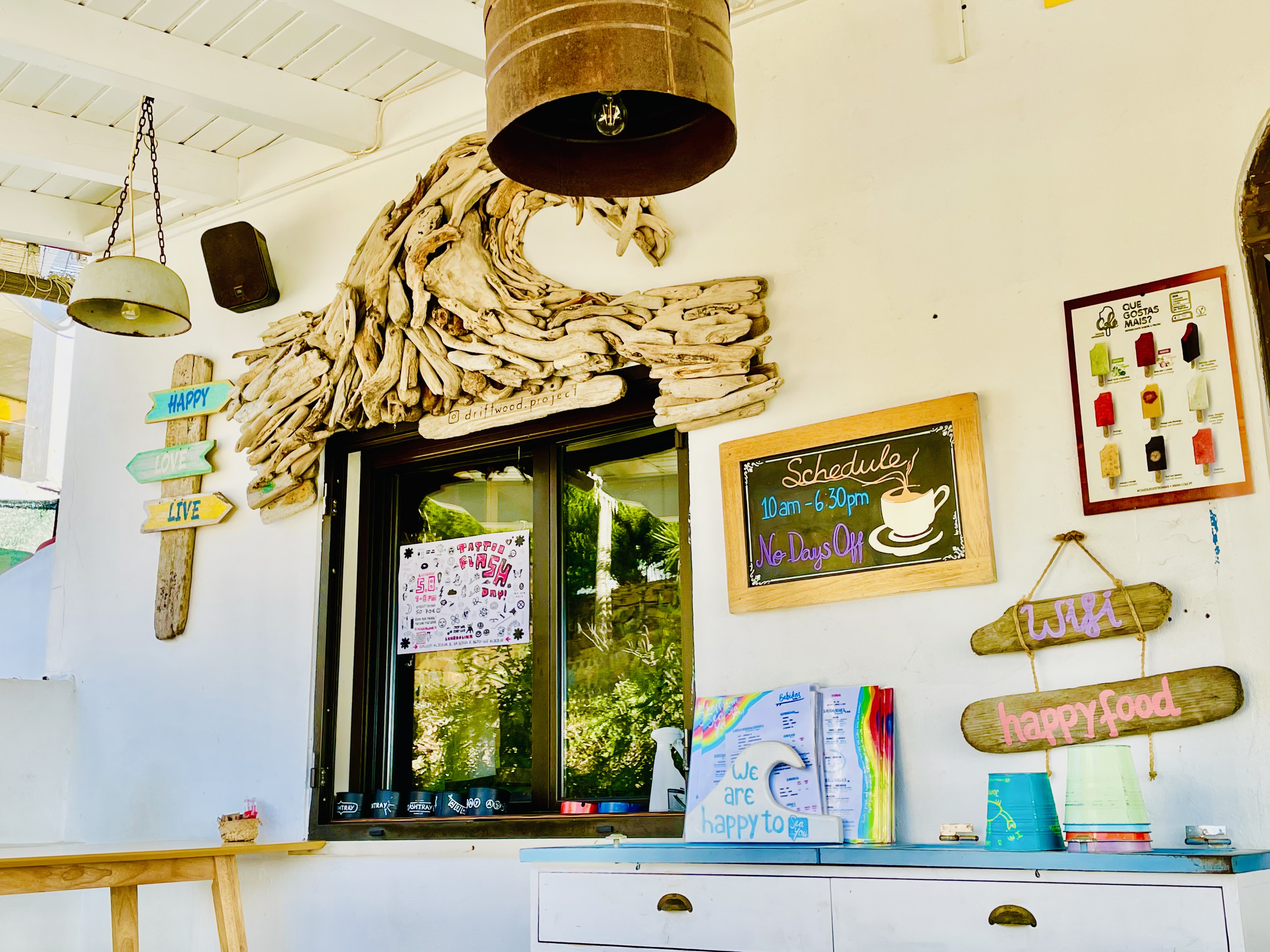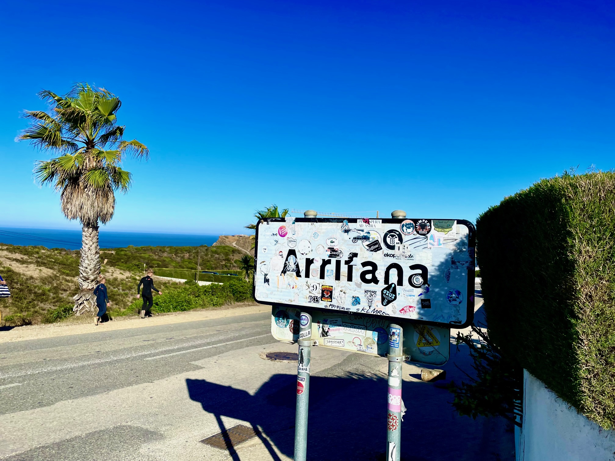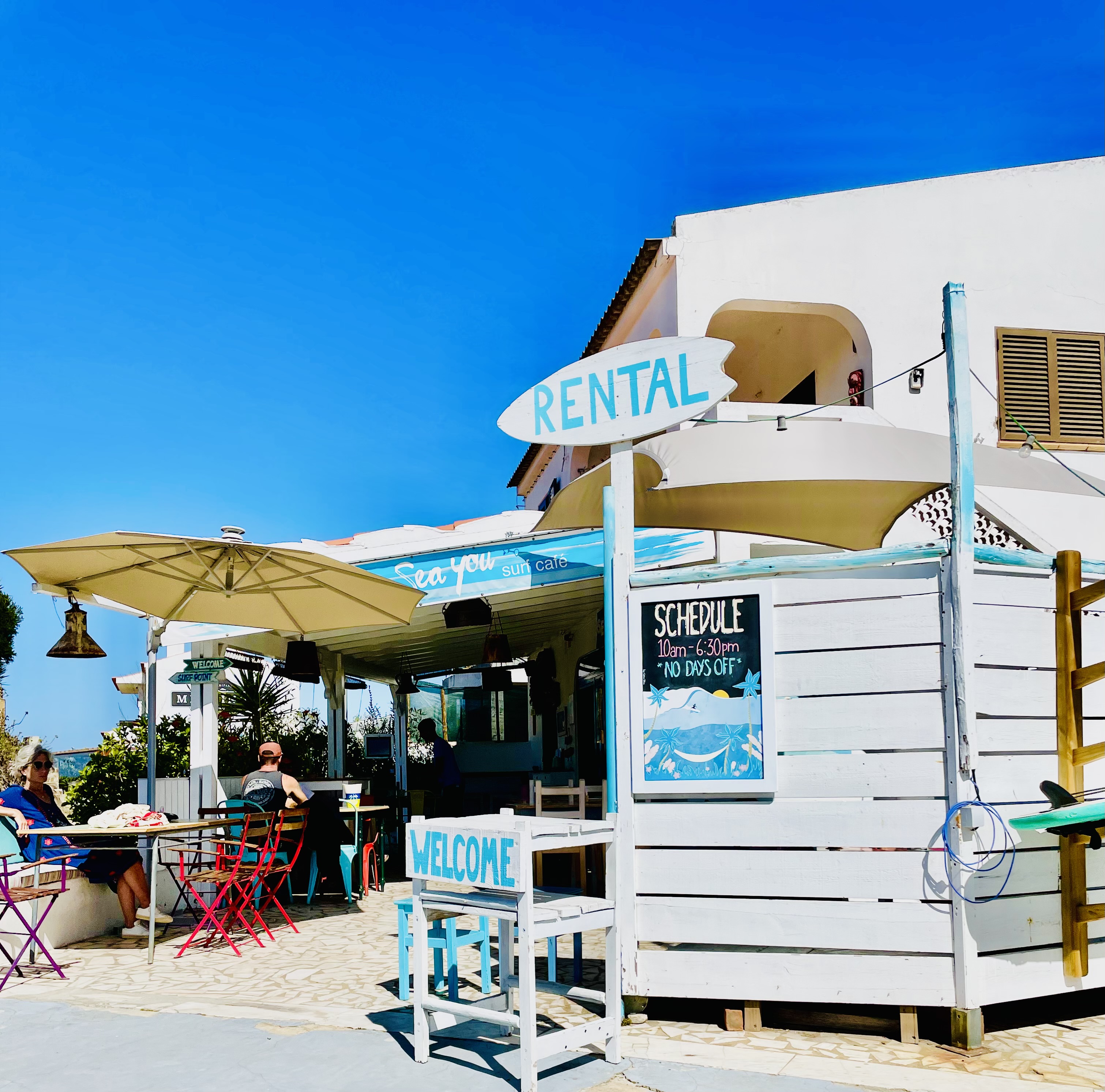Karo hatte uns das „Sea You Surfcafé“ gezeigt. Dieses hervorragende Café wird in den Tagen zu so einer Art Basislager für uns in Arrifana. Hier zieht es uns immer wieder hin. Zum Frühstück gibt es stets frisch gepressten Orangensaft, ausgezeichneten Galão, Bowls mit frischen Früchten und überragende Toasts. Nach dem Surfkurs wollen die Kinder dann stets ebenfalls noch mal ins Sea You um die ausgehungerten Energiereserven mit Pancakes, Smoothies und Burgern aufzufüllen. Manchmal gesellen sich Karo und Renato noch dazu und so verbringen wir viele, viele Stunden im Sea You Surfcafé. An manchen Abenden gibt es dort Live-Musik und Tobi, Karo und Renato meinen, dass wir da auf jeden Fall mal hin müssen. Daher reservieren wir einen Tisch und verabredeten uns für den Abend. Vorher fahren wir mit unserem Caddy aber erstmal zurück in die Berge und verbringen eine ausgiebige Siesta auf der Terrasse unter den Weinreben. Die Kinder erzählen immer wieder, wie viel Spaß das Surfen macht und fordern uns auf „Wellenreiten“ von den Sportfreunden Stiller und „Die perfekte Welle“ Juli auf die Urlaubsplaylist aufzunehmen. Zwei Klassiker, die uns die nächsten Tage intensiv begleiten werden.