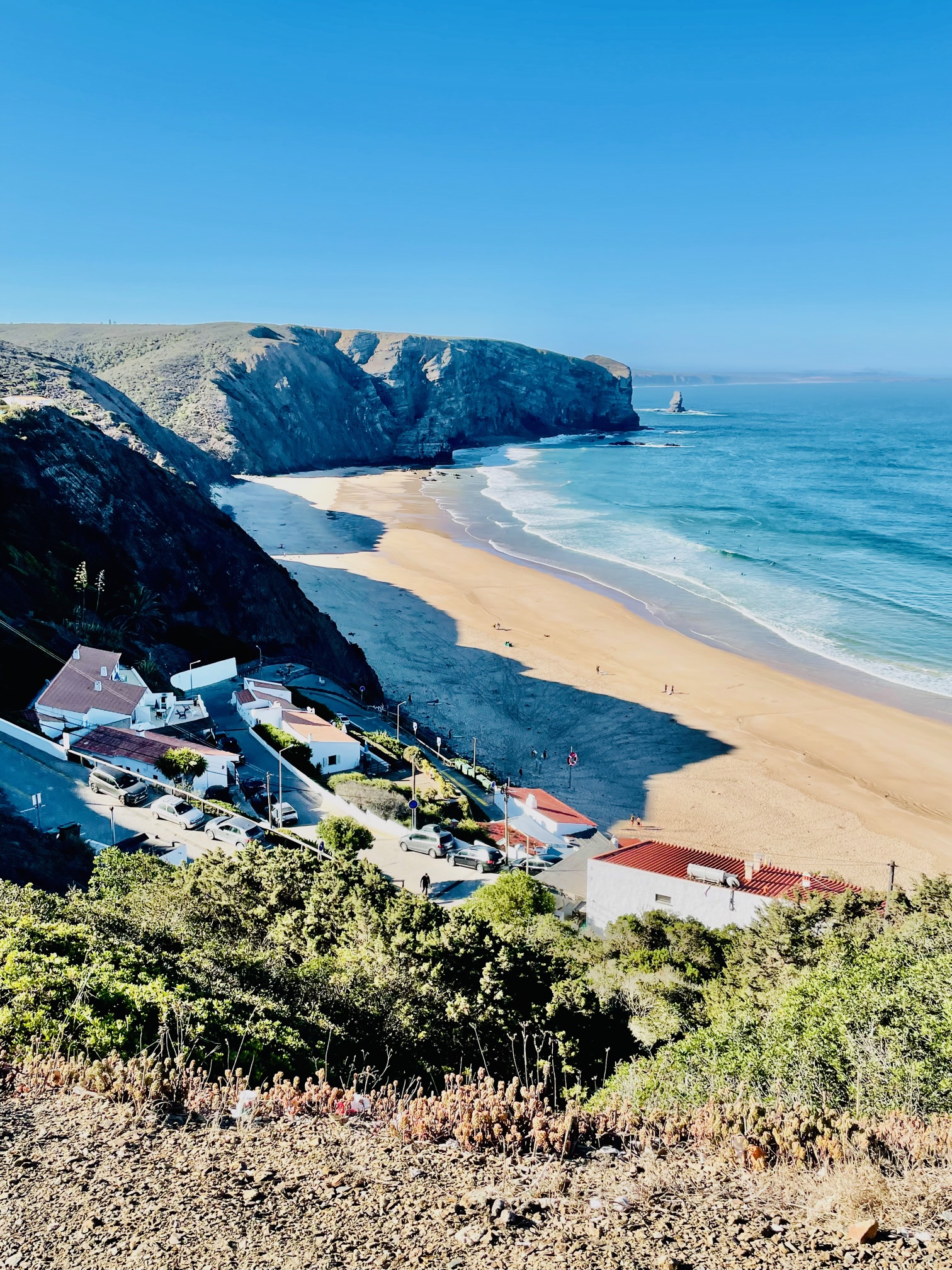 Es ist ein Samstag, an dem Tobi und Renato von der „Boom“ nachhause kommen. Sie sind noch etwas gezeichnet von den Anstrengungen, die so ein Musikfestival mit sich bringt, aber es ist eine große Freude Tobi nach so langer Zeit wieder zu sehen. Mit Tobi haben wir einst in Hamburg zusammen studiert, auch danach immer den Kontakt gehalten und in der Zeit der Corona-Pandemie haben wir uns dann nicht mehr gesehen. Aber Tobi ist ganz der Alte, wie immer. Zum Glück. Zudem lernen wir endlich Renato kennen. Wegen ihm ist Karo ja vor ein paar Jahren nach Portugal ausgewandert und wir haben schon viel von ihm gehört. Und Renato ist ein mega entspannter, fröhlicher Mensch, der es einem einfach macht, mit ihm ins Gespräch zu kommen. Er hat einige Zeit in Köln studiert und spricht daher fließend Deutsch. Das erleichtert es unseren Kindern, mit ihm in Kontakt zu kommen und sowohl Kind 1 als auch Kind 2 schließen Renato sofort ins Herz. Wir können in den folgenden Tagen viel Zeit mit Karo, Renato und Tobi verbringen und lernen nach und nach die ganze Familie kennen. Eigentlich stammt Renatos Familie aus dem Norden Portugals, er ist aber vor ein paar Jahren wegen dem Surfen nach Monte Clérigo gezogen. Und die Familie verbringt schon seit je her ihren Sommerurlaub hier unten. Es erfüllt uns mit großer Dankbarkeit, dass uns hier alle so herzlich aufnehmen und uns ein bisschen an ihrem portugiesischen Leben teilhaben lassen. Mit jedem Tag bemerken wir, dass sich die Natürlichkeit und die entspannte Lebensweise der Leute mehr und mehr auf uns überträgt. Ein Freund von Karo prägt den Satz: „Es gibt keine Probleme, es gibt nur Lösungen.“ Eine Aussage, die wir uns versuchen hinter die Ohren zu schreiben, für Zeiten, wenn es im grauen Alltag mal wieder an allen Ecken und Enden ruckelt und knirscht.