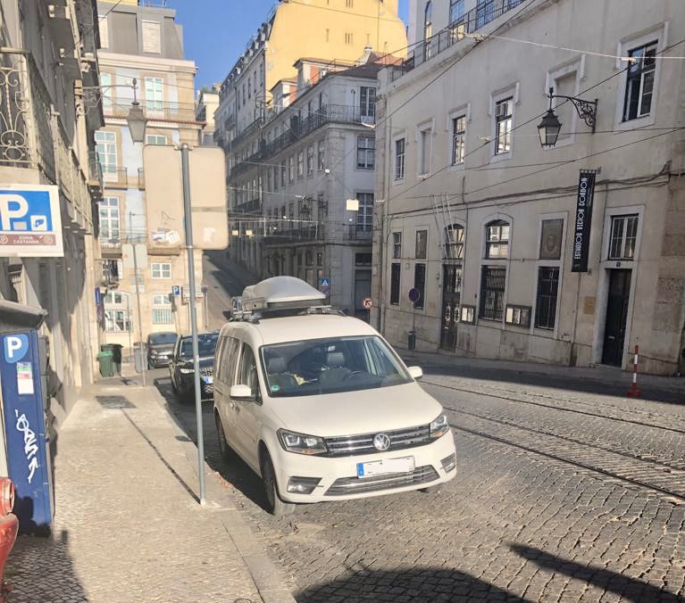 Wir kämpfen uns mit dem Caddy weiter mutig durch diesen ganzen Trubel. Irgendwann stehen wir vor dem Cristiano Ronaldo Hotel aber wir bemerken, dass das mit dem Parken schwierig wird. Wir halten kurz in einer Verbotszone und fragen an der Hotel-Rezeption. Dort wird uns mitgeteilt, dass es keine Hotel eigenen Parkmöglichkeiten gibt. Auf die Frage, ob es eine Idee gibt, wo wir parken können, wischt sich der Mitarbeiter an der Rezeption müde den Schweiß von der Stirn und sagt nur: „It’s absolute chaos out there because of the Pope. The only thing I can do, is wish you good luck.” Wir verstehen. Ernüchtert kehren wir zum Caddy zurück. “Good luck” können wir jetzt wirklich gebrauchen. Google Maps führt uns zu einem unterirdischen Parkhaus, in das wir den Caddy über eine kreiselnde Einfahrt beherzt hinab steuern. Als wir an der Schranke stehen, wird uns schlagartig klar, dass wir mit unserer Dachbox die Einfahrthöhe deutlich überschreiten. Jetzt haben wir Puls: Hinter uns hat sich eine Autoschlange gebildet und wir können nicht vor und nicht zurück. Über den Notrufknopf an der Schranke ist niemand erreichbar. Wir können also nur rückwärts aus dem Parkhaus wieder nach oben kreiseln. Dafür müssen aber erstmal alle Autos hinter uns das gleiche tun. Das ist plötzlich eine absolute Stresssituation. Aber uns bleibt nichts anderes übrig, als ruhig zu bleiben und die hinter uns stehenden Fahrzeuge freundlich auf unser Problem aufmerksam zu machen. Wir wissen, dass so eine Situation in einem deutschen Parkhaus für großen Unmut gesorgt hätte. Die Leute in Lissabon bleiben aber erstaunlich gelassen und setzen alle die steile Einfahrt zurück. Irgendwann haben wir auch den Caddy unter größter Anspannung aus der misslichen Lage befreit und sind wieder oben auf der Straße. Eine Situation, über die man später herzlich lachen wird, aber die echt unangenehm ist, wenn man gerade drinsteckt. Jetzt haben wir zwar das drängendste Problem gelöst, aber immer noch keinen Parkplatz. Wir kreiseln also weiter durch die engen Gassen der Lissaboner Altstadt. Die Papstfreunde aus aller Welt sind so zahlreich, dass sie in ihren Gruppen teilweise die ganze Straße einnehmen. Wir stecken also fest, zwischen all den Pilgern und müssen zusätzlich noch den vielen Straßenbahnen ausweichen. Irgendwann treten schwer bewaffnete Polizisten an unseren Caddy und fordern uns auf, rechts ranzufahren. Die Polizisten sperren hektisch die ganze Straße ab und kurz darauf jagen drei schwarze Limousinen in einem Polizeikonvoi an uns vorbei über das holprige Pflaster. Die Kinder fragen „War das der Papst?“ und wir zucken nur mit den Schultern. Schweißgebadet sitzen wir im Caddy und fragen uns kopfschüttelnd, wie das nun weiter gehen soll. Als wir uns umblicken, bemerken wir, dass uns die Polizei hier auf einen gekennzeichneten Parkplatz geschickt hat. Es gibt auch einen Parkscheinautomat. Google Maps ermittelt, dass es von hieraus 10 Minuten Fußweg zum CR7-Hotel sind. Wir steigen aus und fragen einen dieser schwerbewaffneten Polizisten vorsichtig, ob wir hier parken dürfen. Die strenge Antwort lautet: „You can park here. But don’t drive anywhere. We’re closing the street every hour from now because of the Pope.” Mit dieser Aussage könne wir leben. Wir entschließen uns also, die nötigsten Sachen zu packen und zu Fuß zum CR7-Hotel zu laufen. Wir erwerben über die Park Now App noch schnell eine geradezu unverschämt teure Parkberechtigung. Aber das ist uns jetzt auch egal. Und dann geht es zu Fuß steile Straßen hinunter und wenig später wieder steile Straßen hinauf. Wir kämpfen uns durch die Massen an Papstfreunden und stehen irgendwann tatsächlich vor dem CR7-Hotel. Mit letzter Kraft checken wir ein und lassen uns kurz darauf erstmal in die weichen Betten des Pestana CR7 Hotel Lisboa fallen.