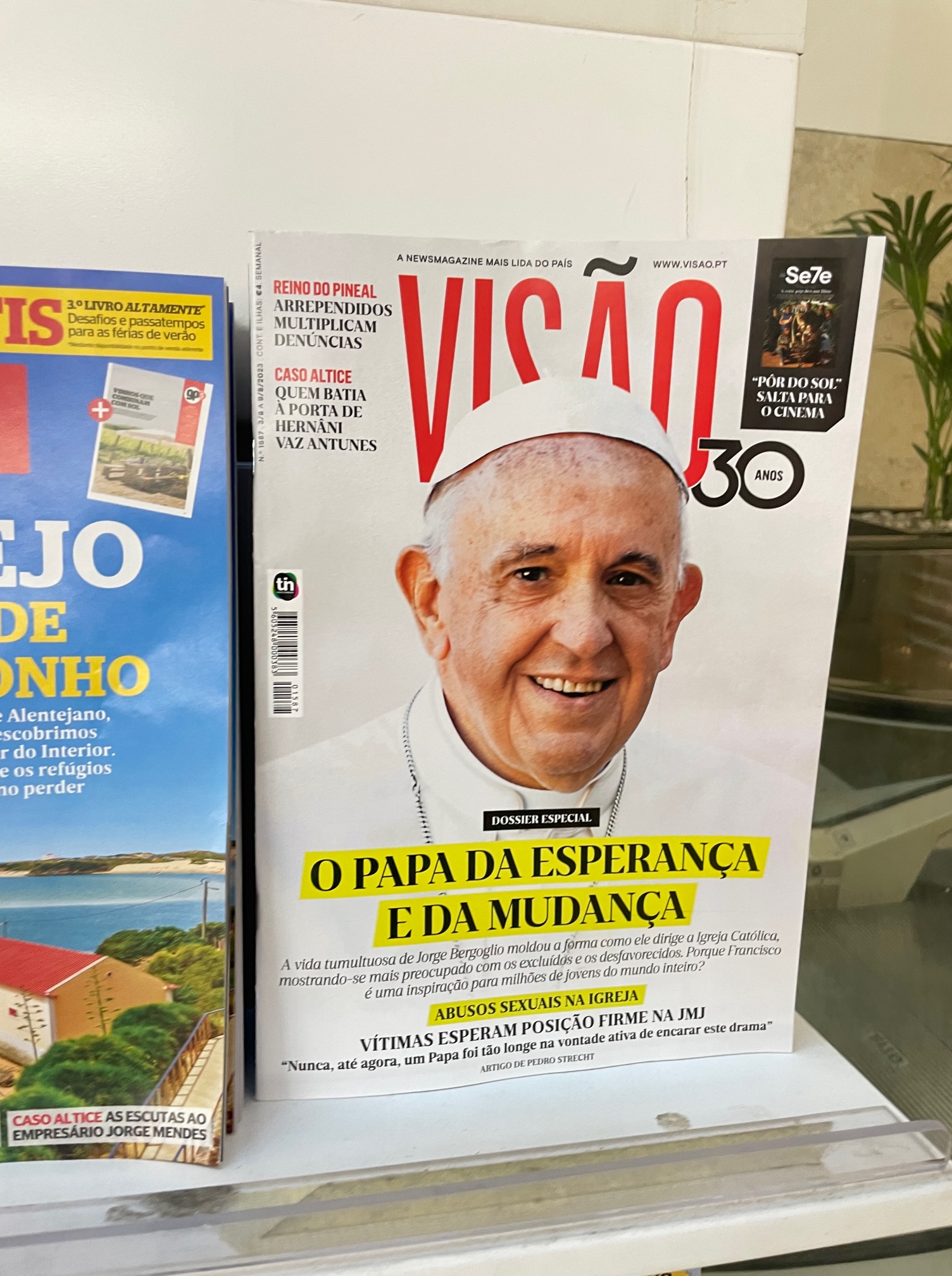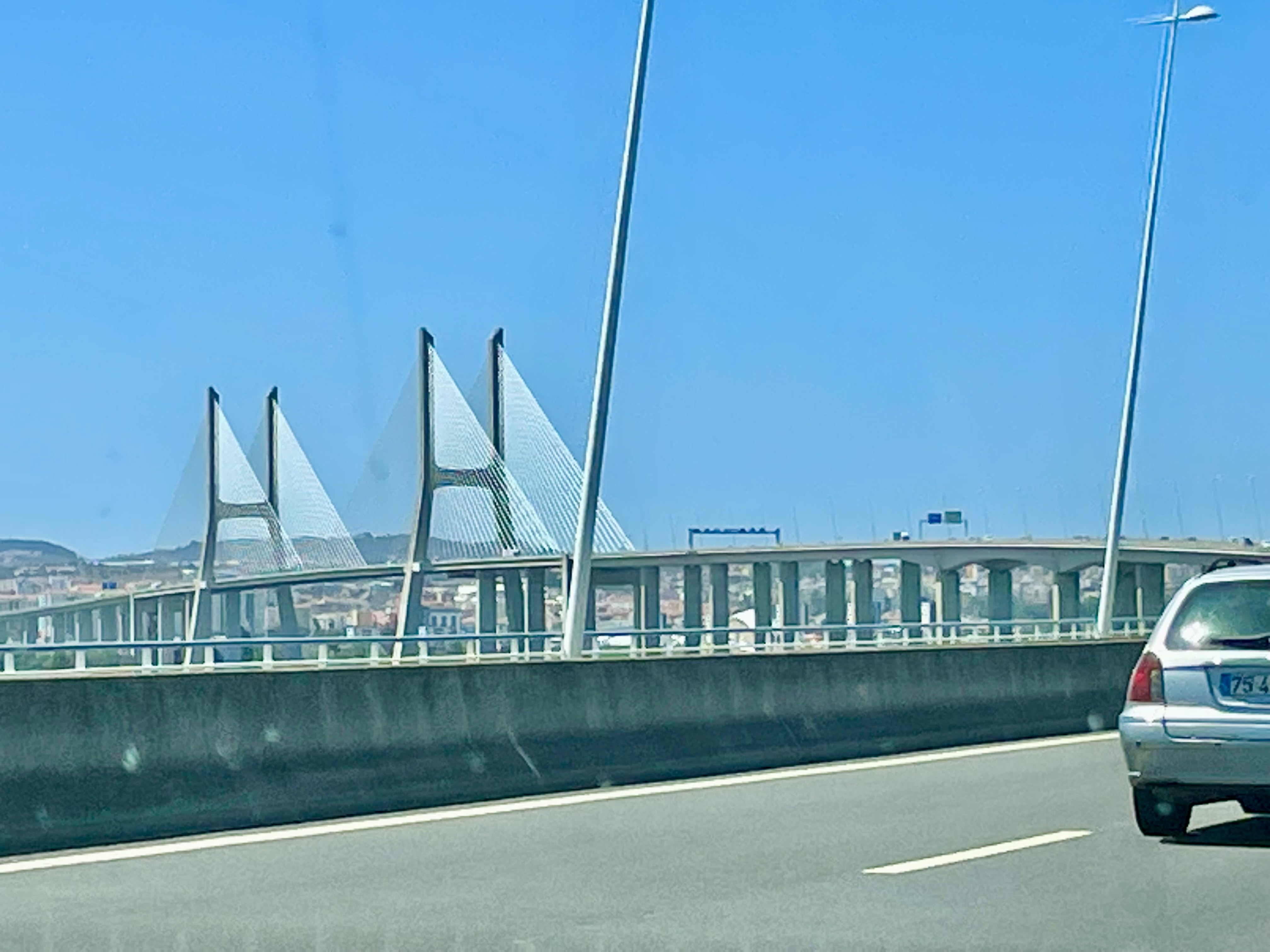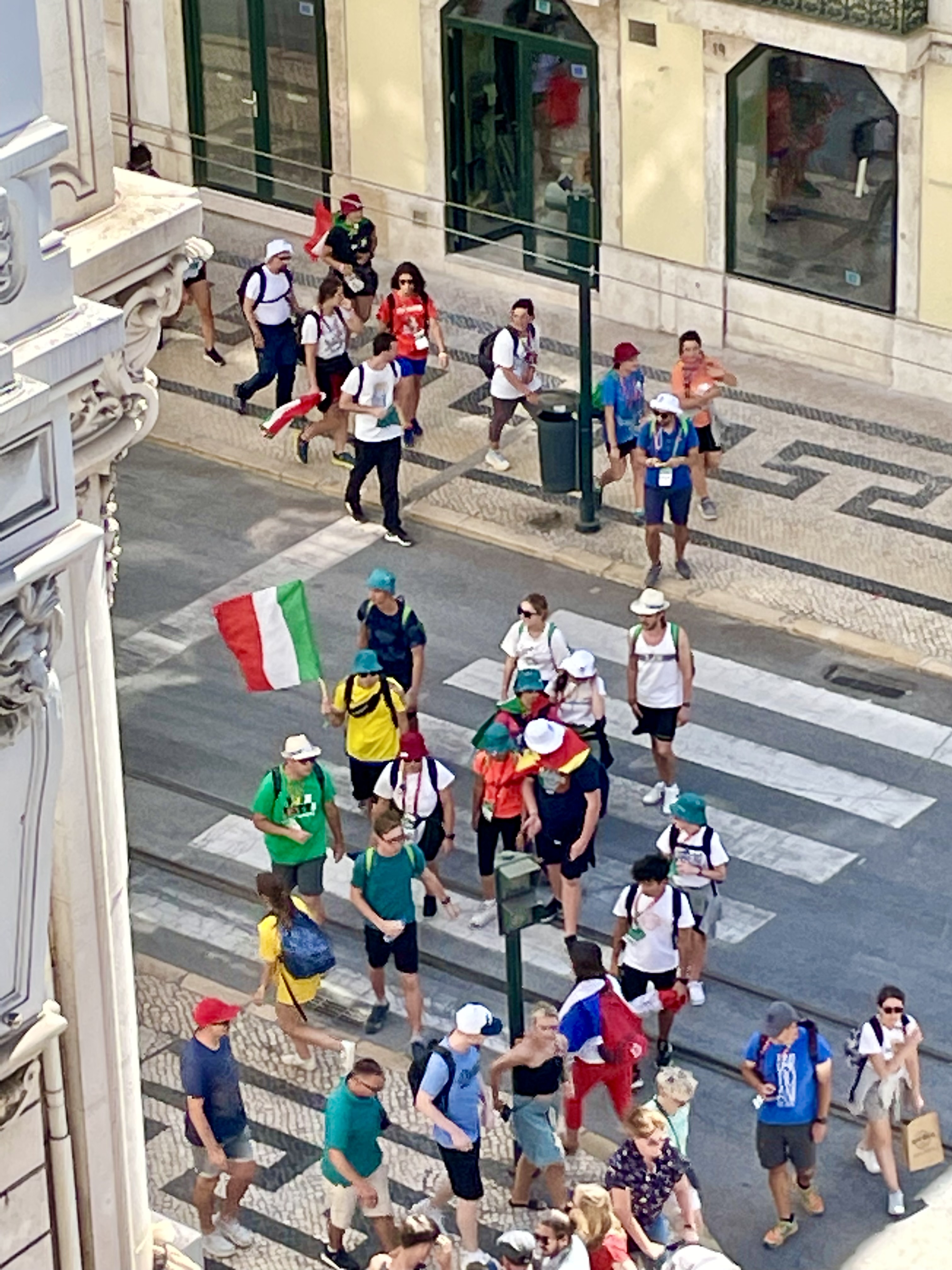 Obwohl wir aktiv nachgefragt haben, konnte uns niemand in Portugal erklären, wie das mit den Autobahngebühren funktioniert. Die einhellige Antwort, die wir erhielten, war: „Fahrt einfach und denkt nicht nach.“ Und so machen wir es. Es ist wenig los auf der Strecke und so machen wir kontinuierlich Meter. Irgendwann kurz vor Lissabon erreichen wir dann doch eine handelsübliche Mautstation, an der wir die Gebühr per Karte entrichten können. Nachdem die Besiedlung entlang der Autobahn deutlich zu genommen hat und wir große Industriegebiete durchfahren haben, türmt sich am Horizont eine gigantische Brücke auf. Wir haben also die Ponte Vasco da Gama erreicht. Jene riesige Brücke, die auf über 17 km Länge über den Tejo führt. Vor der Brücke müssen wir noch einmal Maut entrichten und als wir über dem Wasser fahren, bemerken wir, welch heftiger Wind über die Brücke pfeift. Wir haben daher alle Hände voll damit zu tun, den Caddy in der Spur zu halten und ihn gegen die tückischen Seitenwind-Böen anzusteuern. Daher können wir die kolossale Aussicht von der Brücke nur bedingt genießen. Es nimmt einige Minuten in Anspruch, bis wir den Tejo überquert haben. Als wir von der Brücke rollen, fällt uns auf der rechten Seite auf einer Freifläche eine riesige Bühne auf, um die herum provisorische Zuschauertribünen aufgestellt sind. Die Straße folgt nun dem Tejo in westlicher Richtung. Die Verkehrsdichte nimmt merklich zu aber der Caddy kämpft sich eifrig vorwärts. Links sind nun haushohe Kreuzfahrtschiffe an der Kaimauer des Tejo festgemacht. Wir steuern weiter stabil auf die Innenstadt zu. Was uns auffällt, sind riesige Menschengruppen, die gemeinsam unterwegs sind. Einige tragen Landesflaggen bei sich. Wir überlegen, ob die Fußball WM kurzfristig in Lissabon ausgetragen wird, können dies aber eigentlich ausschließen. Je näher wir dem Stadtzentrum kommen, umso mehr dieser Gruppen sind unterwegs. Mexikanische Flaggen hier, französische dort. Dazu Brasilianer, Argentinier, Australier und US-Amerikaner. Einige Gruppen tragen große Holzkreuze mit sich. Langsam dämmert uns etwas: Die große Bühne an der Brücke, die Menschengruppen aus aller Welt und die Holzkreuze… Kann es sein, dass der Papst in der Stadt ist? Wir zücken hektisch das Mobiltelefon und bemühen Google. Und tatsächlich: In diesen Tagen findet der katholische Weltjugendtag in Lissabon Stadt. Und ausgerechnet heute und morgen ist Papst Franziskus in der Stadt. Da wir seit Wochen im Urlaubsmodus sind und uns wenig mit aktuellen Nachrichten und dem Weltgeschehen befasst haben, ist uns diese Nachricht natürlich durchgerutscht. Na das kann ja was werden. Kind 2 meldet von der Rückbank: „Da ist man einmal in seinem Leben in Lissabon und dann ist der Papst auch da.“ Wir müssen lachen und uns fällt die Textzeile vom Westernhagens Song „Freiheit“ ein, in der er singt: „Und der Papst war auch schon da, und mein Nachbar vorneweg…“