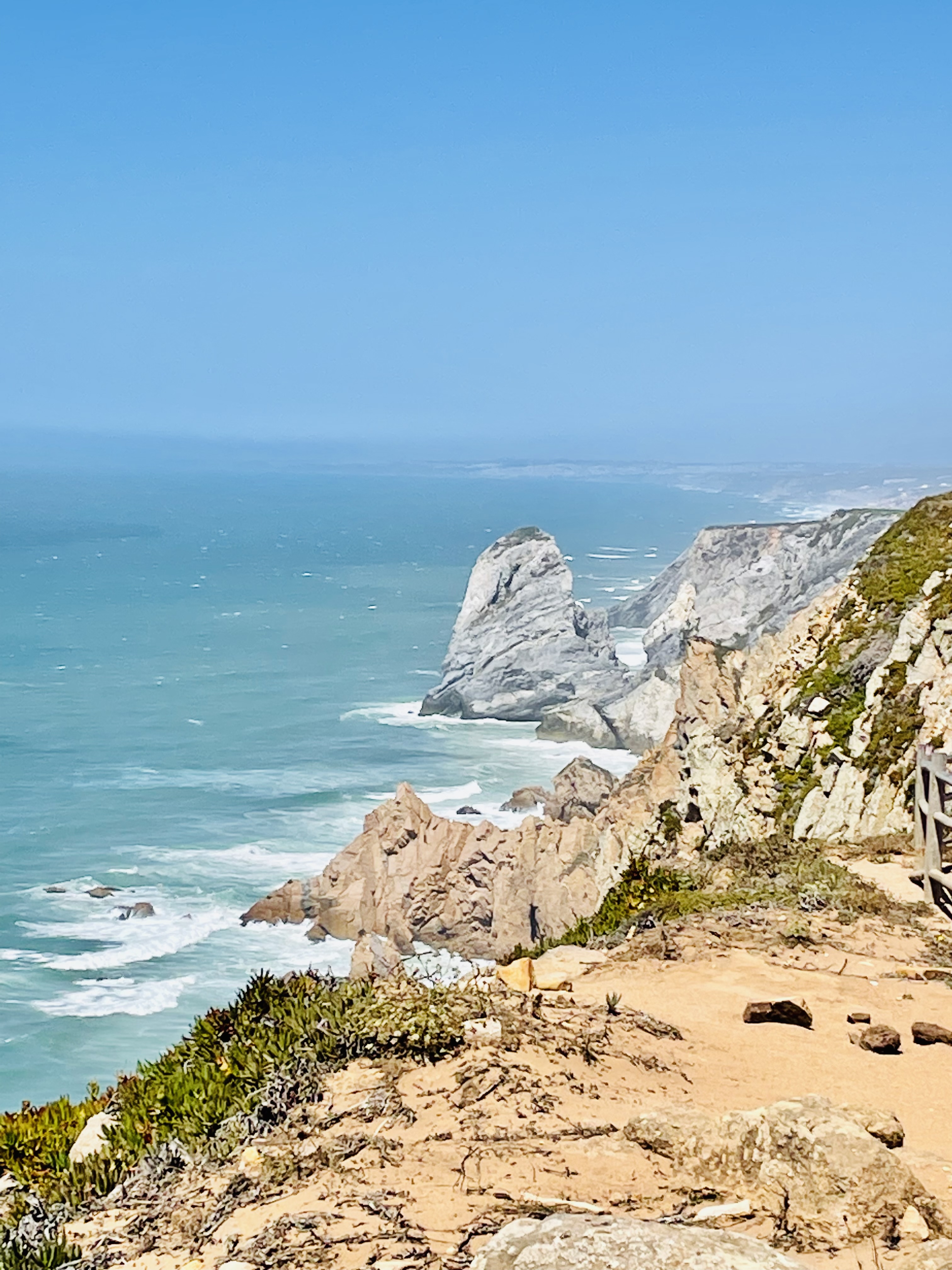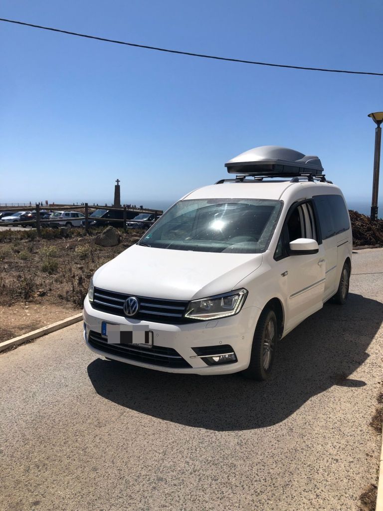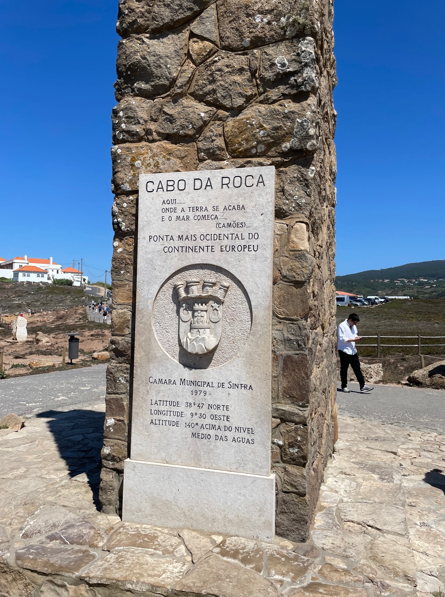 Wir haben nun also unsere Bucket List für Portugal quasi abgearbeitet. Alles erledigt. Da wir aber früher als geplant in Lissabon aufgebrochen sind, haben wir nun mehr Zeit als geplant zur Verfügung. Diese Zeit nutzen wir, um einen 40minütigen Trip zum „Cabo da Roca“ zu unternehmen. Wir finden, dass das eine Runde Sache ist. Vor wenigen Wochen waren wir unten in Tarifa am südlichsten Punkt Europas, dann sollten wir hier jetzt auch noch den westlichsten Punkt mitnehmen. Der liegt ja quasi vor der Haustüre von Lissabon. Die Navi-App leitet uns zielsicher über die Autobahn. Wir fahren vorbei an der Rennstrecke von Estoril, wo einst die Formel 1 um WM-Punkte fuhr. Dann geht es weiter auf kurvenreichen, schmalen Straßen die Küste entlang. Und schließlich erreichen wir die steilen Klippen, auf denen ein weithin sichtbarer Leuchtturm thront. Wir stellen den Caddy auf einem gebührenpflichtigen Parkplatz ab und machen uns zu Fuß auf den Weg. Als wir aus dem Caddy aussteigen, pfeift uns sofort der starke Wind um die Ohren. Nach wenigen Metern haben wir die steinerne Säule erreicht, die auf den westlichsten Punkt Europas hinweist. Auch hier sind Pilgergruppen vor Ort aber in dem weitläufigen Arial ist genug Platz für alle. Einer Touristin neben uns reißt der Wind den Hut vom Kopf und dieser fliegt die Klippen hinab. Riesige Möwen segeln im Wind, unten tost der Atlantik. Es ist wieder ein ergreifendes Gefühl an diesem Punkt zu stehen und auf das große Meer hinaus zu schauen. Hier kommt jetzt für tausende Kilometer nichts als Ozean. Bis irgendwann Amerika aus dem Wasser auftaucht. Was müssen das für verrückte Hasardeure gewesen sein, die sich vor Jahrhunderten auf diesen tosenden Ozean hinaus wagten, um neue Seewege zu erschließen? Wir sind ja auch schon ganz zufrieden damit, dass wir es mit unserem Caddy hier bis an den westlichsten Punkt Europas geschafft haben. Aber da raus auf den Ozean, würden wir uns niemals wagen. Schon gar nicht in diesen schwimmenden Nussschalen, mit denen beispielsweise Kolumbus unterwegs war.